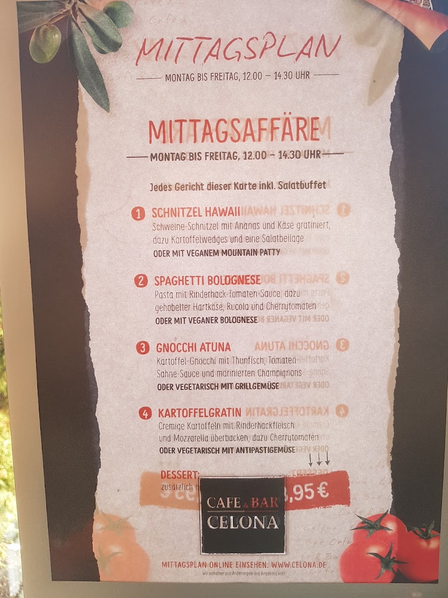 For those looking for a trendy, bustling locale that feels both welcoming and dynamic, incorporating elements of an American diner, Cafe & Bar Celona is indeed a go-to destination. Its lively ambiance coupled with attentive service and a diverse menu makes it a perfect spot for both casual meet-ups and special occasions. Whether you're there for a hearty breakfast or unwinding with friends over cocktails, you're sure to have an experience that lingers long after your visit. So make your way to Wolfsburg, and don't forget to stop by for an unforgettable time!